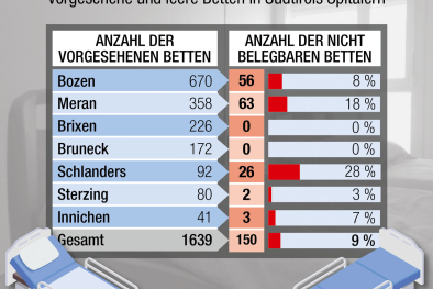Sanitätsbetrieb: (js) In den sieben Südtiroler Krankenhäusern gibt es 1.639 Betten. Davon sind vorübergehend 150 geschlossen, das ...