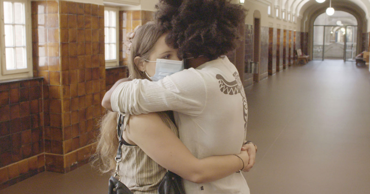 Ein Paar nackter Füße auf dünnen Matten wie in einer Turnhalle. Der linke Fuß zeichnet einen Halbkreis. Dann tanzen zwei Frauen durch das Kamerabild. Eine trägt die Haare offen, die andere in einem Pferdeschwanz. Die beiden Frauen taumeln über die Turnmatten, verlieren das Gleichgewicht, ihre Beine geben scheinbar nach. Doch sie bewegen sich nicht unkontrolliert: Tänzerisch versuchen sie zu testen, wie es ist, sich fallen zu lassen. Gleichzeitig üben sie, wie sie sich wieder erholen können von dem Fall, die Energie des Falls vielleicht sogar umwandeln.