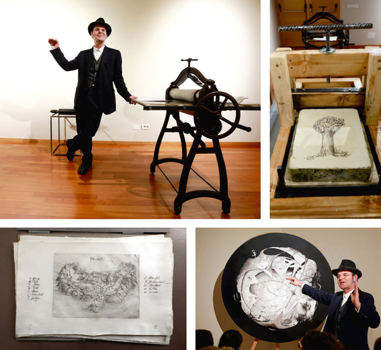 Grafik – Dietmar Gamper: (avg) Dietmar Gamper ist ein analoger Kerl in einer digitalen Welt. Zumindest kann sich der Theatermacher, der abgelegen in Gfrill oberhalb von Tisens sein Zuhause gefunden hat, bestens so inszenieren: wie er am Ende der Einführung über sein grafisches Werk lässig die Taschenuhr herausholt und dazu einlädt, die „Makulatur“ seiner Drucke zu entdecken. Alles Digitale ist ihm zuwider.