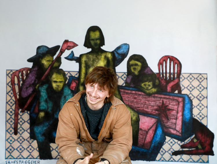 Besucht man Philipp Silvestro Geier bei der Arbeit, weiß man nicht recht, was überraschender ist: der Ort, an dem er arbeitet, oder die Arbeit, die er verrichtet, oder besser: die Art und Weise, wie er sie verrichtet. Der Ort, das ist der „Bunker 23“, jener Bunker, der südlich von Mals Teil der Verteidigungslinie des „Vallo Alpino del Littorio“ war, Mussolinis Alpenwall. Die Arbeit, der Geier nachgeht, ist indes eine künstlerische: Er ist Maler. Und wie er malt, ist eindrucksvoll; seine kraftvolle Bildsprache entzieht sich der schnellen Einordnung.