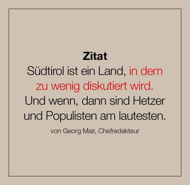 Es wäre über vieles zu reden. Aber Südtirol ist immer noch ein Land, in dem zu wenig diskutiert wird. Und wenn, dann sind die Hetzer und die Populisten am lautesten – und kaum jemand fällt ihnen ins Wort.