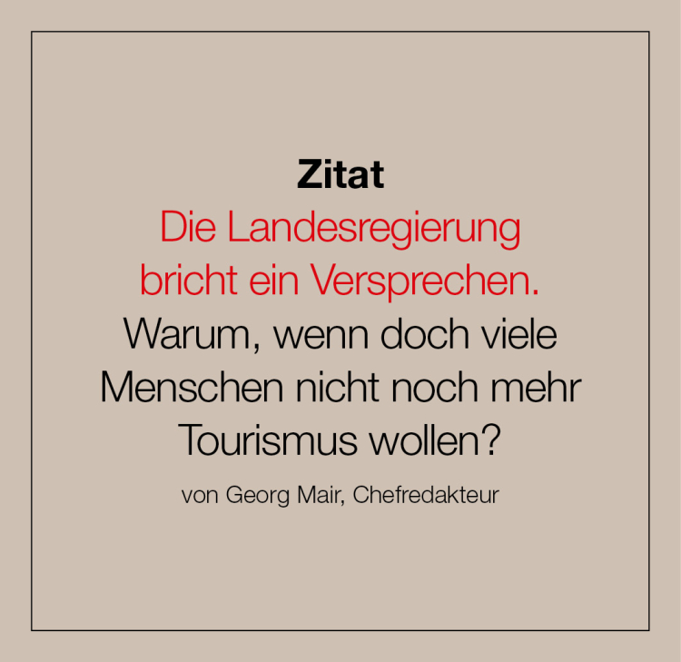 Hat Walcher das mit den Seinen in der Landesregierung und mit dem Rest der Partei schon ausgehandelt? Es ist jedenfalls eine Bloßstellung seines Vorgängers, der viel in dieses Vorhaben investiert und politisch dafür bezahlt hat. Und es ist ein Affront gegen den Teil der Gesellschaft, der genug hat von den immer neuen Rekorden im Tourismus, der gehofft hat, diese Industrie werde sich selbstbestimmt mäßigen. 38,2 Millionen Übernachtungen waren es im Jahr 2025.