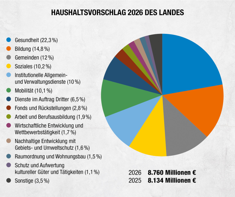Südtirol – Landeshaushalt: (js) Bereits zum zweiten Mal in Folge übersteigt der Landeshaushalt die Acht-Milliarden-Grenze: Für 2026 sind 8,76 Milliarden Euro vorgesehen – ein neuer Rekord. Der Entwurf wurde am 31. Oktober von der Landesregierung genehmigt.
