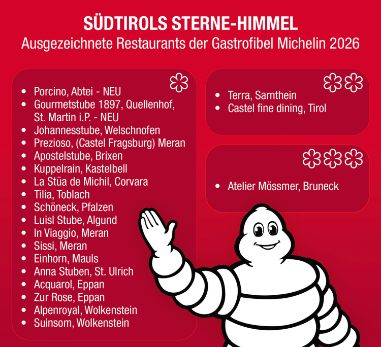 Restaurants steigt erstmals auf 21. Damit verfügt Südtirol unter allen Provinzen Italiens über die meisten Kochgrößen mit der begehrten Auszeichnung. Die bisherigen Ein-Sterne-Restaurants wurden mit Ausnahme des „Zum Löwen“ in Tisens (das nach dem Tod der Köchin Anna Matscher