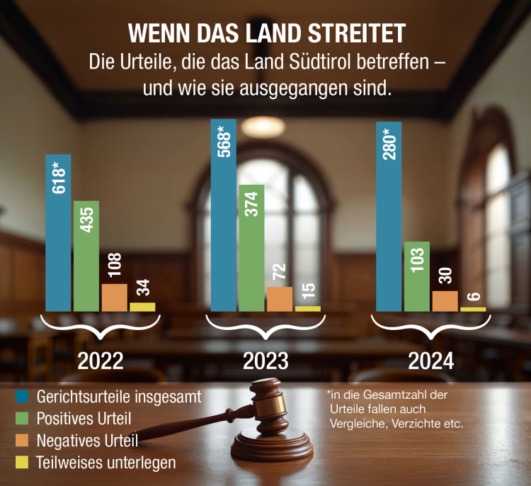 Gericht – Landesverwaltung: (aw) In Südtirol gibt es etwas über 1.000 Anwälte (ff 47/25), einige davon arbeiten für die Anwaltschaft des Landes. Und die hat gut zu tun. Wie viel, wollte Paul Köllenspeger, Landtagsabgeordneter des Team K, in einer Anfrage an Landeshauptmann Arno Kompatscher wissen. In den Jahren 2022 bis 2024 war Südtirol in Rechtsstreitigkeiten vor ver-