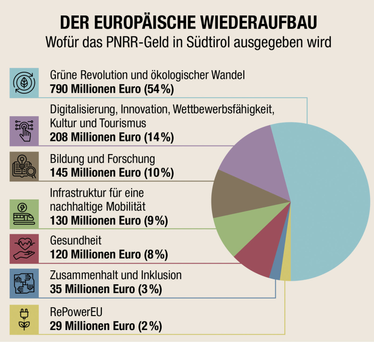 EU-Wiederaufbaufonds: (avg) Die Milliarden, mit denen die Europäische Union Italiens Wirtschaft nach der Corona-Pandemie wieder aufpeppeln wollte, finden auch nach Südtirol. Und das zuhauf: Bislang wurden hierzulande bereitsmehr als 4.000 Projekte aus dem Wiederaufbaufonds „Piano nazionale di ripresa e resilienza“ (PNRR) genehmigt, teilt das Landespresseamt mit. Gesamtvolumen: 1,46 Milliarden Euro. Vergleicht man diese Summe mit dem Landeshaushalt, ist das ungefähr ein Sechstel, das Südtirol zusätzlich ausgeben kann. Vorgabe: Die eingereichten Projekte müssen mit