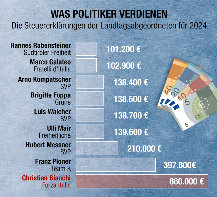 Ganz oben in der Rangliste steht der Landesrat für Vermögen Christian Bianchi (Forza Italia, Teilhaber einer Versicherungsagentur) mit 660.000 Euro, gefolgt von Franz Ploner (Team K) und Hubert Messner (Landesrat für Gesundheit). Ploner und Messner waren beide Primare im Gesundheitsdienst. Den größten Rückgang verzeichnet