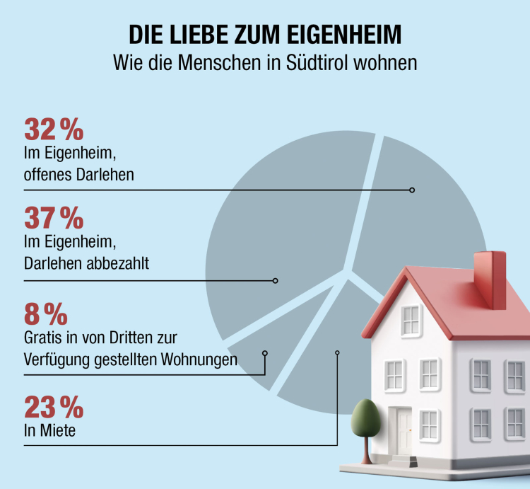 AFI – Erhebung: (gm) 69 Prozent der Menschen in Südtirol leben im Eigenheim, 37 Prozent davon haben es abbezahlt. Nur 23 Prozent wohnen zur Miete. Die Zahlen hat das Afi (Arbeitsförderungsinstitut) in seinem jüngsten Barometer erhoben.