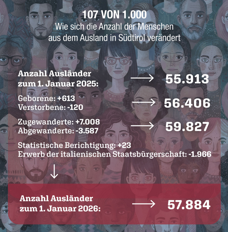 Astat – Ausländische Wohnbevölkerung: (doc) In Südtirol leben rund 58.000 Menschen aus dem Ausland, sie kommen aus 149 Ländern der Erde. Die meisten davon aus Albanien (12 Prozent), Deutschland (8), Pakistan und Rumänien (je 7). Das teilt das Landesstatistikinstitut Astat mit.