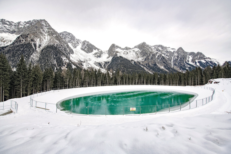 Ausstellung – Fotoforum Bozen: (gm) Für die Olympischen Spiele (ausgetragen auch in Antholz und Cortina) kommt diese Fotoschau zu spät, aber sie dokumentiert mit einem kühlen fotografischen Blick, was war – und was ist. Die Bobbahn in Cortina, die aus einem Lärchenwald herausgeschnitten wurde, das neue Speicherbecken für Biathlon in Antholz (Bild), die Straßenarbeiten im Cadore.
