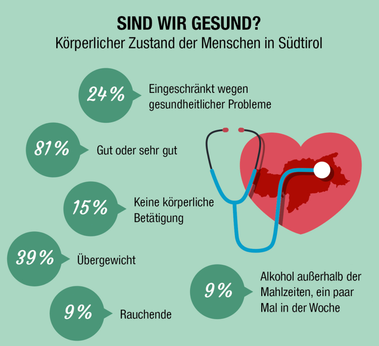 Gesundheit – Statistik: (gm) Die Menschen in Südtirol leben mehrheitlich gesund. So sehen sie es selbst. 81 Prozent, hat das Landesinstitut für Statistik Astat erhoben, betrachten sich als gesund oder sehr gesund. Das liegt weit über dem gesamtstaatlichen Wert von 65 Prozent. Auch das psychische Wohlbefinden ist hoch: Es liegt bei 75 auf einer Skala von null bis 100.