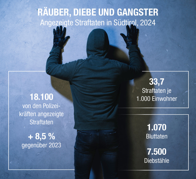 Straftaten – Statistik: (js) Die Lust am Verbrechen zeigt sich nicht nur am Podcast-Konsum, sondern auch in der Realität. In Südtirol ist die Zahl der von der Polizei registrierten Straftaten im Jahr 2024 angestiegen, genauer gesagt um rund neun Prozent gegenüber dem Vorjahr. 2024 zeigten die Polizeikräfte über 18.000 Straftaten bei der Gerichtsbehörde an. Rund 7.800 Tatverdächtige wurden von der Polizei angezeigt, angehalten oder festgenommen. In Südtirol beläuft sich die Rate auf 34 Straftaten je 1.000 Einwohner. Im Trentino sind es 30, auf gesamtstaatlicher