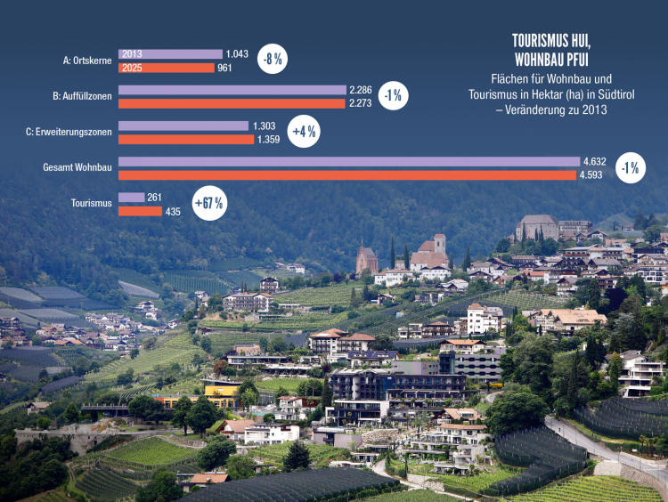 Gekommen ist es anders, zum Beispiel im Tourismus. Die Zonen für Hotels und Campingplätze breiten sich heute, 2025, auf einer Fläche von 435 Hektar aus. Das sind um 174 Hektar mehr als 2013. In Prozenten ausgedrückt: +67 %. Auch Gewerbegebiete oder Straßen sind seitdem deutlich angewachsen.