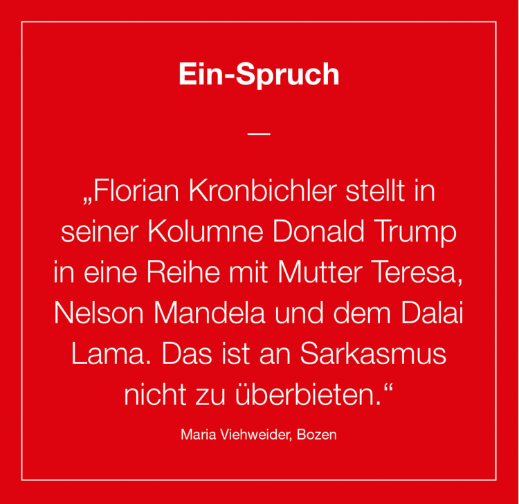 „Eine gute Irgendeine“ hat heuer den Friedens-Nobelpreis bekommen. Florian Kronbichler ist enttäuscht: ein Gutmensch, noch dazu eine Frau! Er hätte gerne Trump zum Nobelpreis gratuliert, dem starken Mann, der jetzt für Frieden in Nahost eintritt.