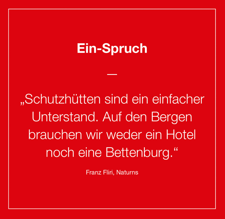 Landesrat Christian Bianchi versucht, für die Lenkjöchlhütte die hohen Kosten zu rechtfertigen mit schwierigen Arbeitsbedingungen am Berg. Oder mit der kurzen Zeitspanne, in der so hoch oben gearbeitet werden kann. Oder mit dem aufwendigen Transport. Auch die Sesvenna- und die Heilbronnerhütte liegen in etwa auf gleicher Meereshöhe. Sie sind bei der Bauausführung mit den gleichen Bedingungen konfrontiert.