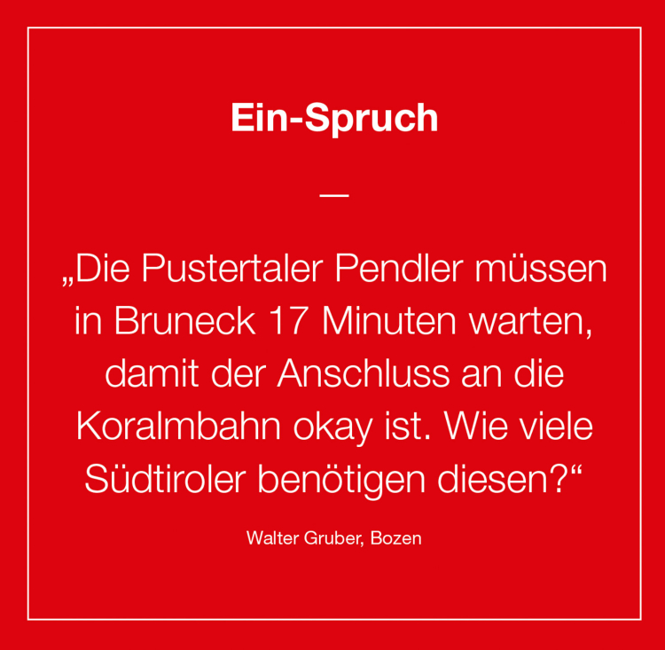 Ich konnte mir lange keine Erklärung für die 17 Minuten Aufenthalt in Bruneck geben. Gott sei Dank habe ich dann die Einladung des Dejaco an eure „liebe Silke ...“ gesehen und mich danach sofort in die Instagram-Erklärung des Verkehrsbeobachters Hannes Sigmund gestürzt. Was ich da lesen musste, war der Hammer: Die Pustertaler Pendler müssen in Bruneck 17 Minuten warten, damit der Anschluss an die Koralmbahn okay ist. Ich hatte keine Ahnung, wo die Koralmbahn ist – wie vermutlich die meisten Landsleute auch. Ich habe es dann herausgefunden und frage mich noch immer, wie viele Südtiroler wohl diesen Anschluss unbedingt benötigen. Aber wie dem auch sei, vielleicht erklärt uns der Verkehrsbeobachter auch, warum man dann diese