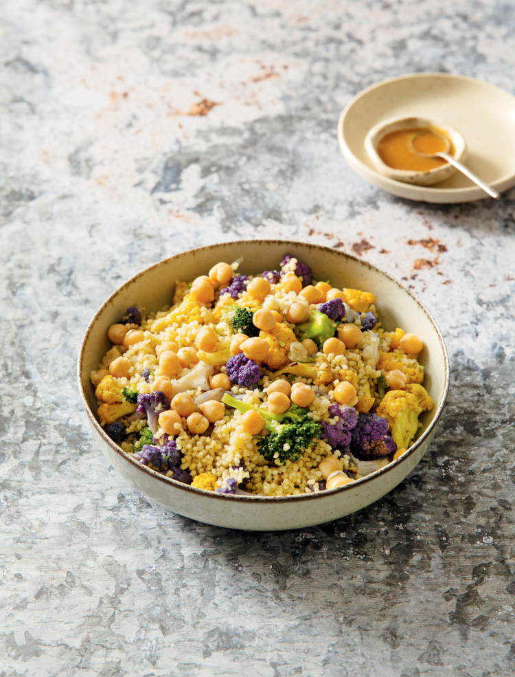 Dieses Gericht gehört zu meinen winterlichen Leibspeisen: Wenn ich spät nach Hause komme, liebe ich es, das Gemüse in den Backofen zu schieben, zu duschen, meinen Schlafanzug anzuziehen und dann wieder in die Küche zu kommen. Bis dahin ist das Gemüse gar, ich bereite nur noch den Couscous und die scharfe Soße zu. In wenigen Minuten ist alles fertig und ich habe ein gesundes und leckeres Abendessen auf dem Tisch.